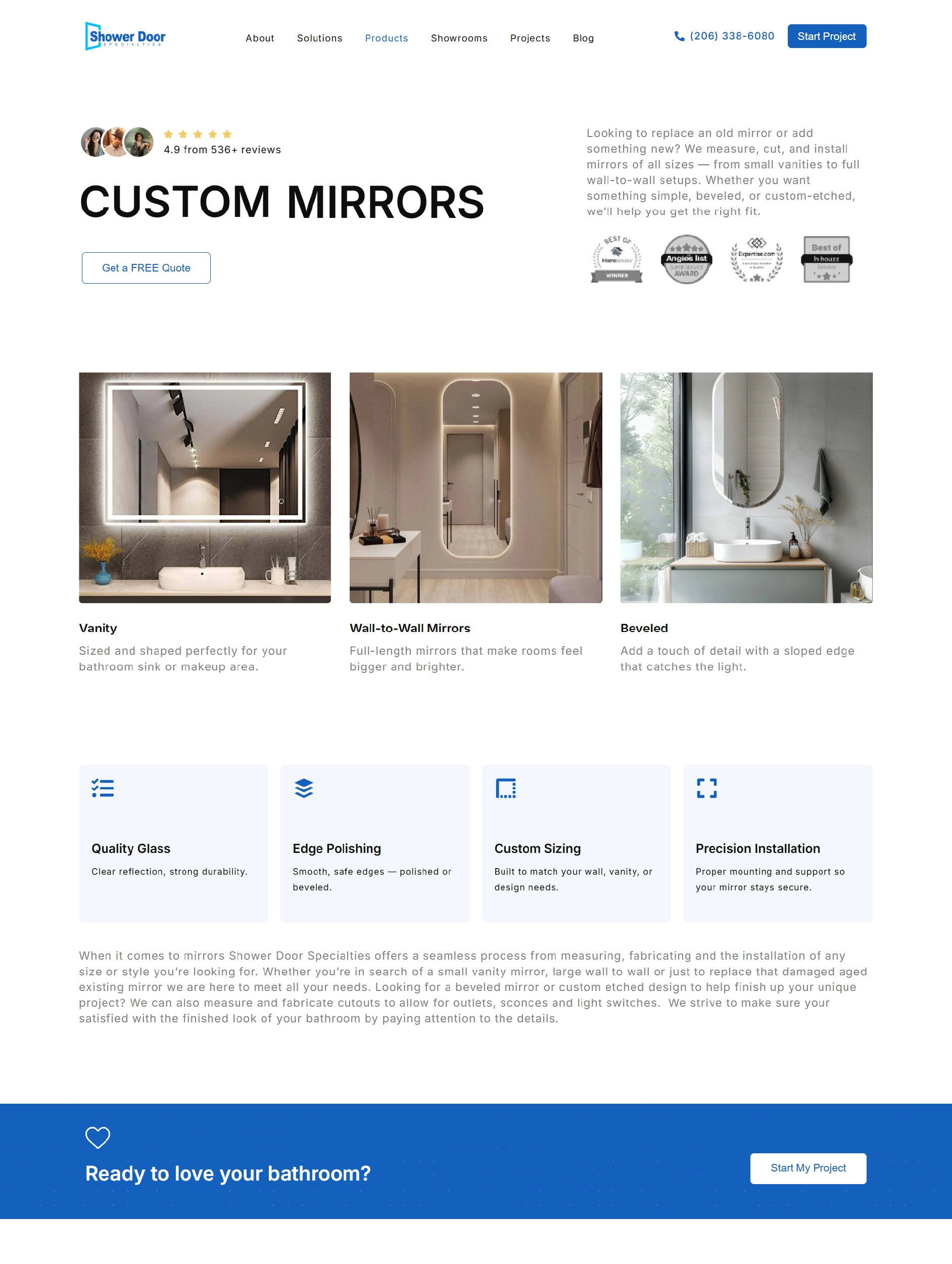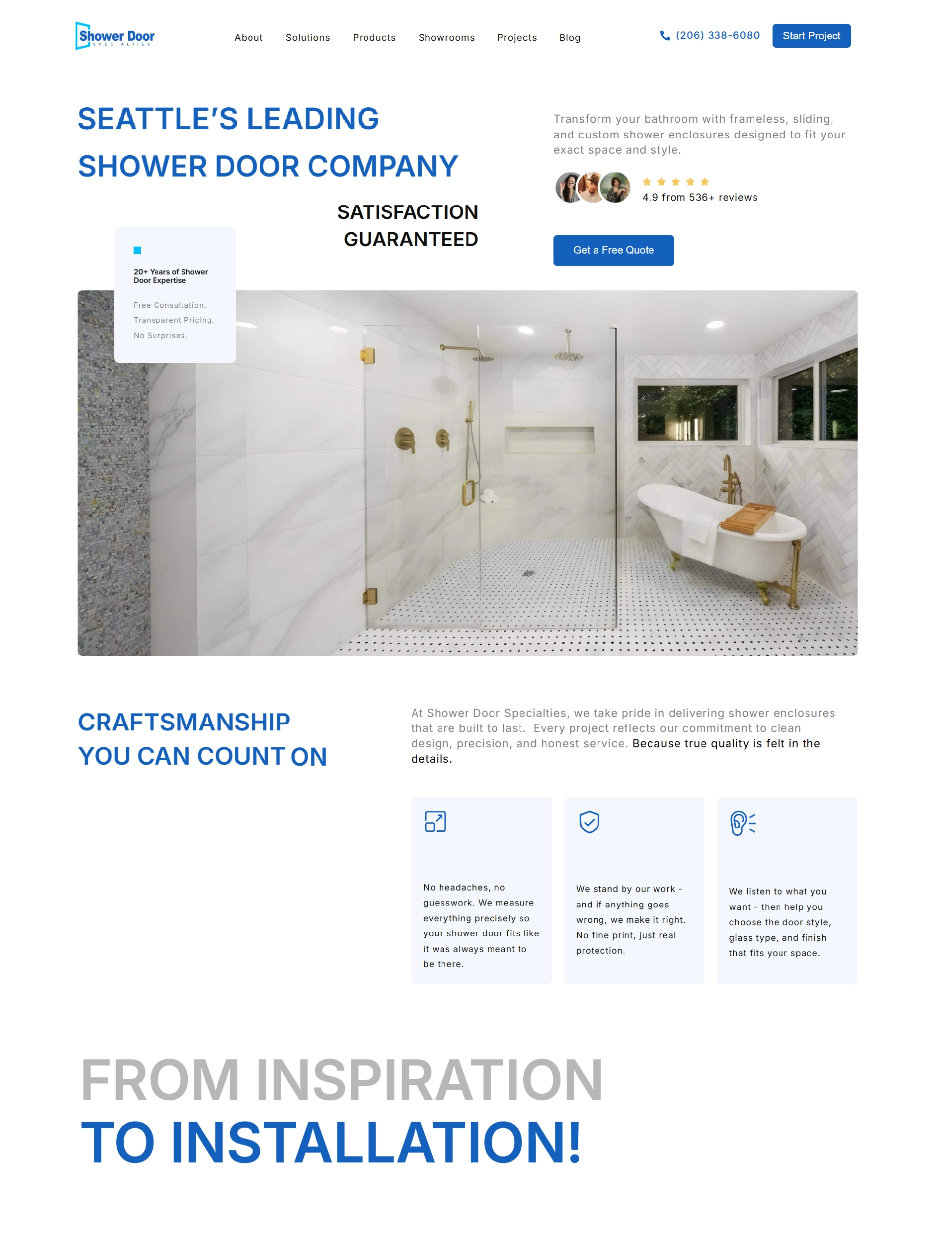 shower door wa is a seattle-based company specializing in custom shower door design and installation. the website highlights the brand’s craftsmanship built over the years and its professional approach to customer service. it allows visitors to easily explore the company’s offerings, including custom-built, frameless, sliding, and steam shower systems.
